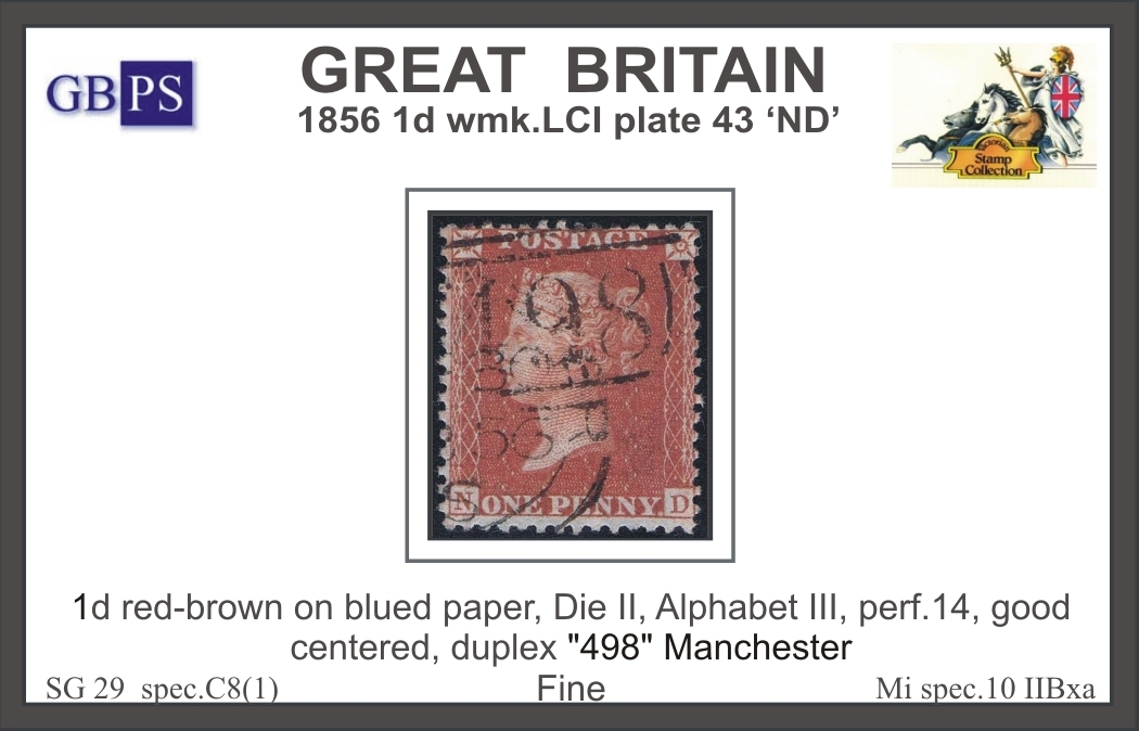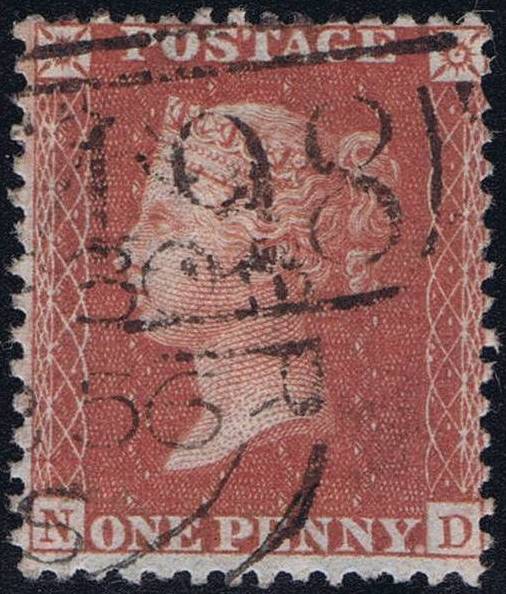 1856 1d PL43 (ND) C 8(1) red-brown (blued paper)