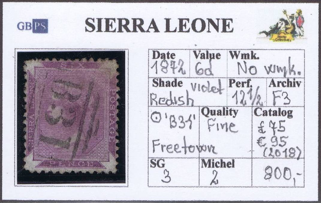 SIERRA LEONE 1872 SG3 6d redish violet WX P12,5 (B31)