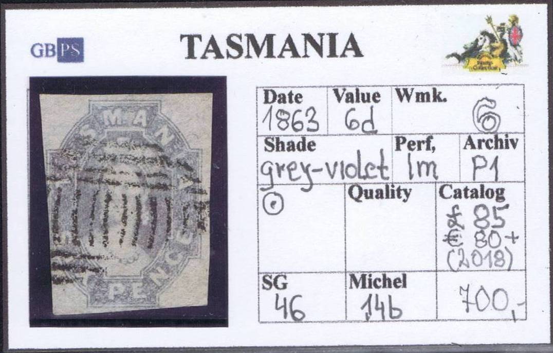 TASMANIA 1863 SG46 6d grey-violet W6 PX (IIII)