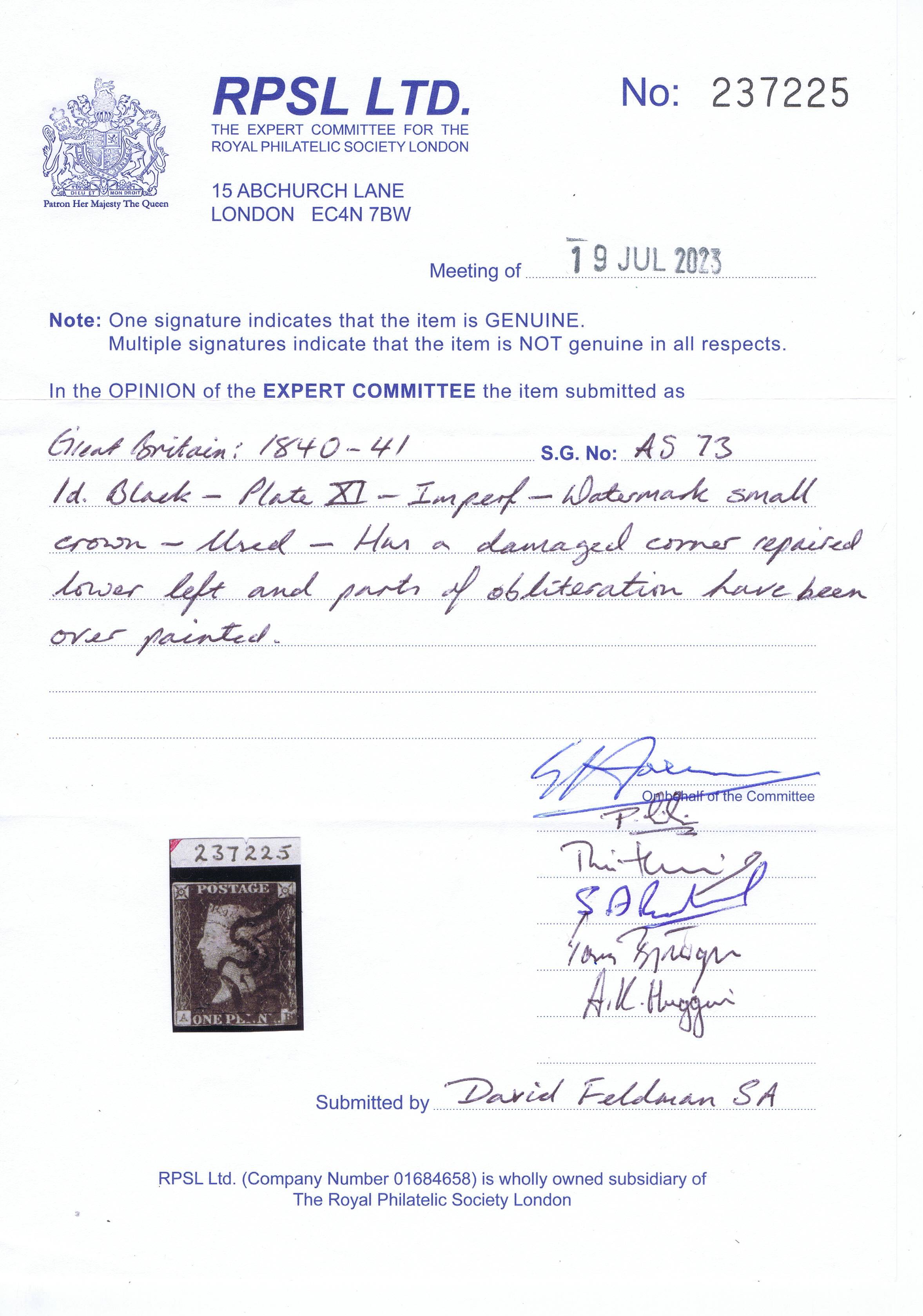 1840 1d PL11 (AB) AS 73 black (RFLNE) A369 PRODÁNO