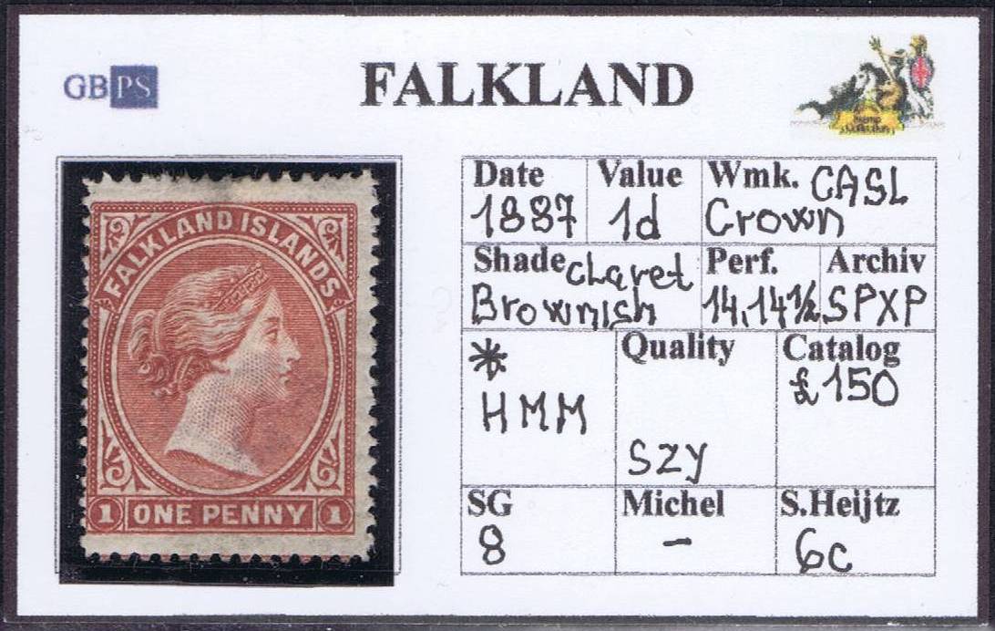 FALKLAND 1885-1891 SG8 1d brownish claret (SH6c) WCCASL