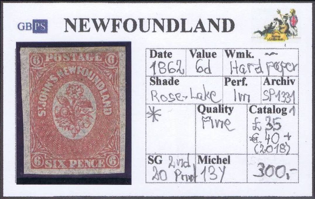 NEWFOUNDLAND 1862 SG20 6d rose-lake HMP (2nd HP) WX imperf M