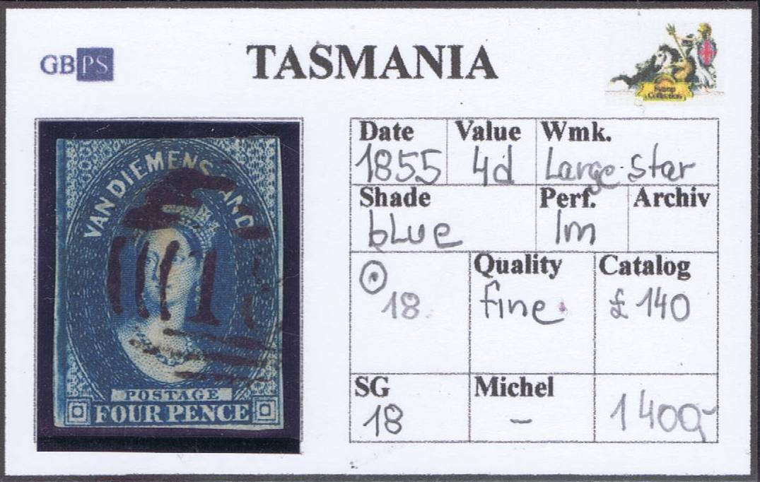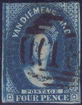 TASMANIA 1855 SG18 4d blue, wmk.LS imperf